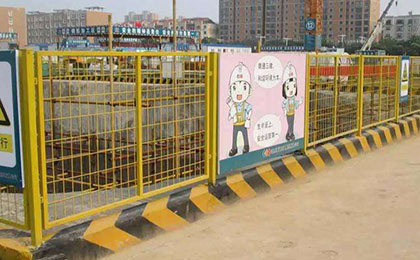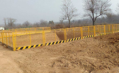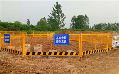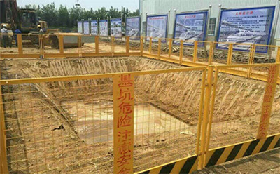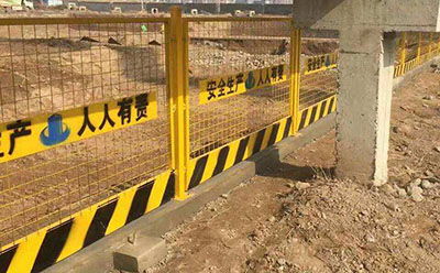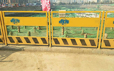 2、基坑護欄表面涂刷黃黑(紅白)相間防銹漆以示警戒,防護內(nèi)側(cè)滿掛密目安全網(wǎng),防護外側(cè)設(shè)20cm高踢腳板。